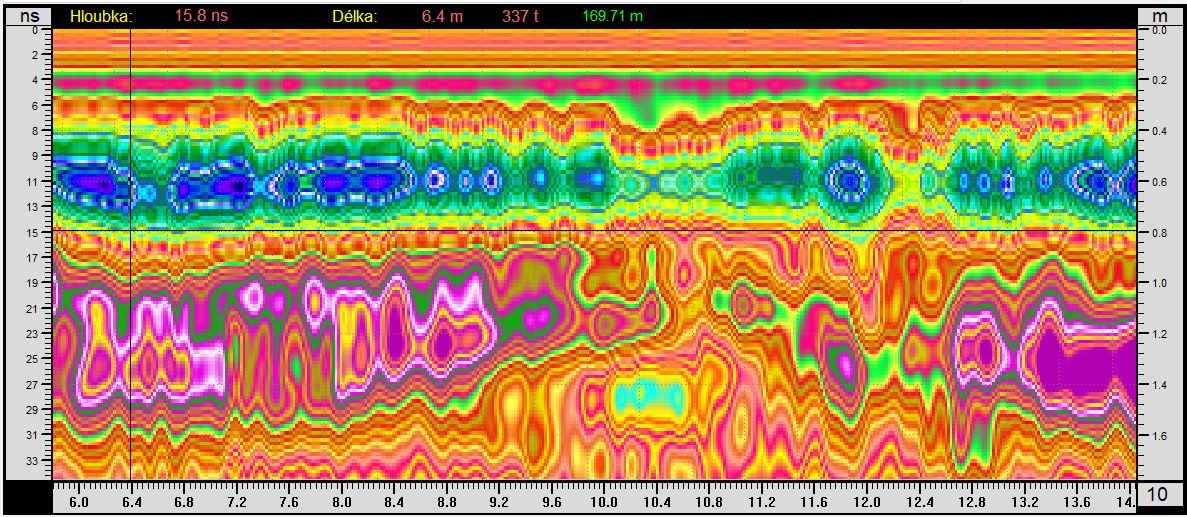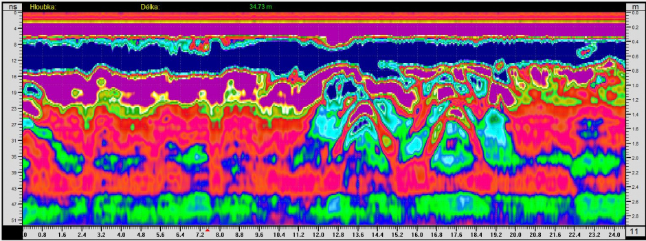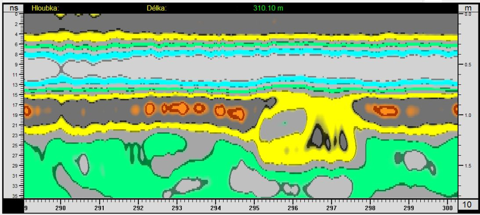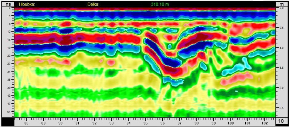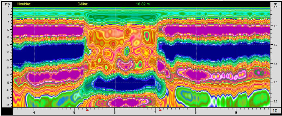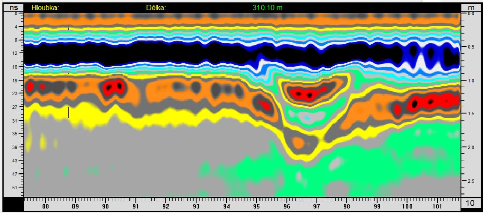 Světle modrý obdélníkový objekt na vzdálenosti 10,4 m, co to je, kov? Shora jsou porušené všechny vrstvy, takže asi výkop a na dně něco 60 x 20 cm....