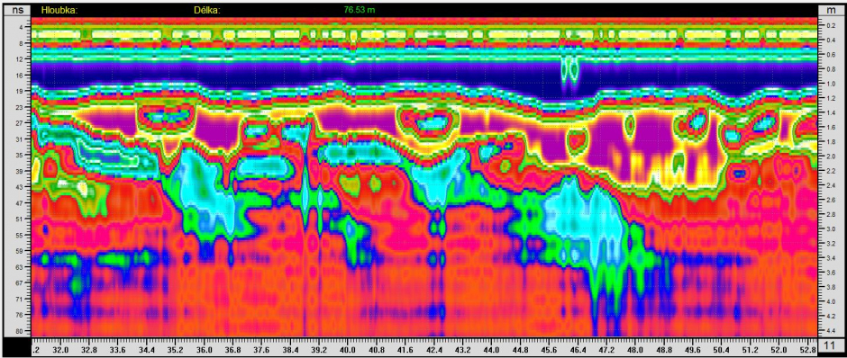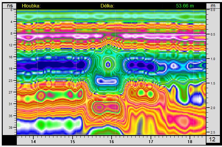 Hroby z průzkumu hřbitova na Kuksu. Odrazy ve tvaru obrácených hyperbol jsou zřejmě od dutin.