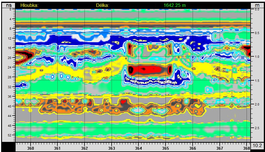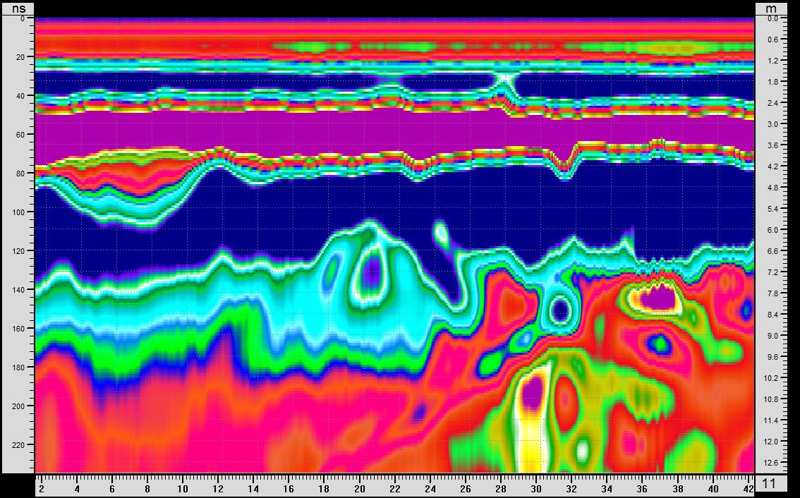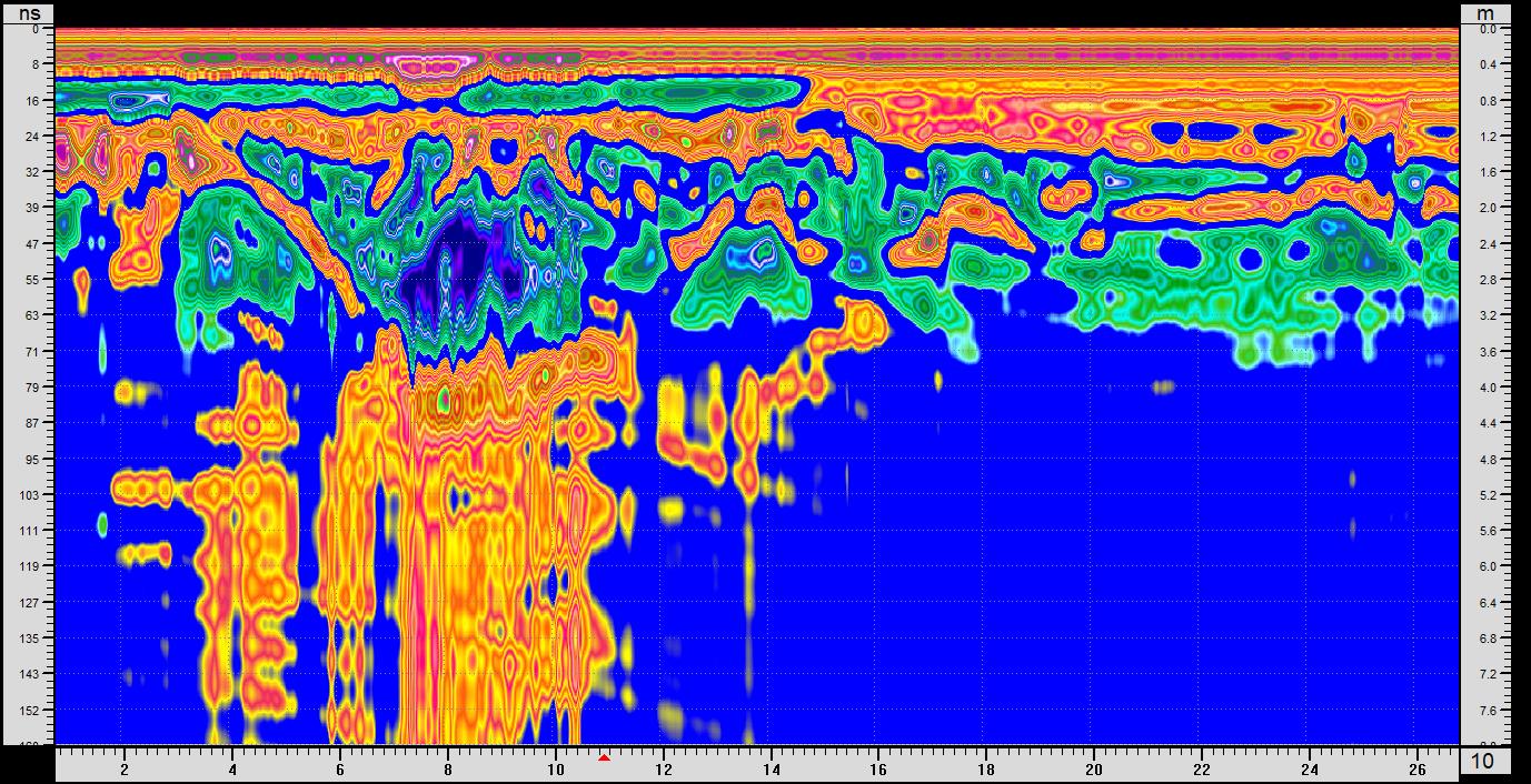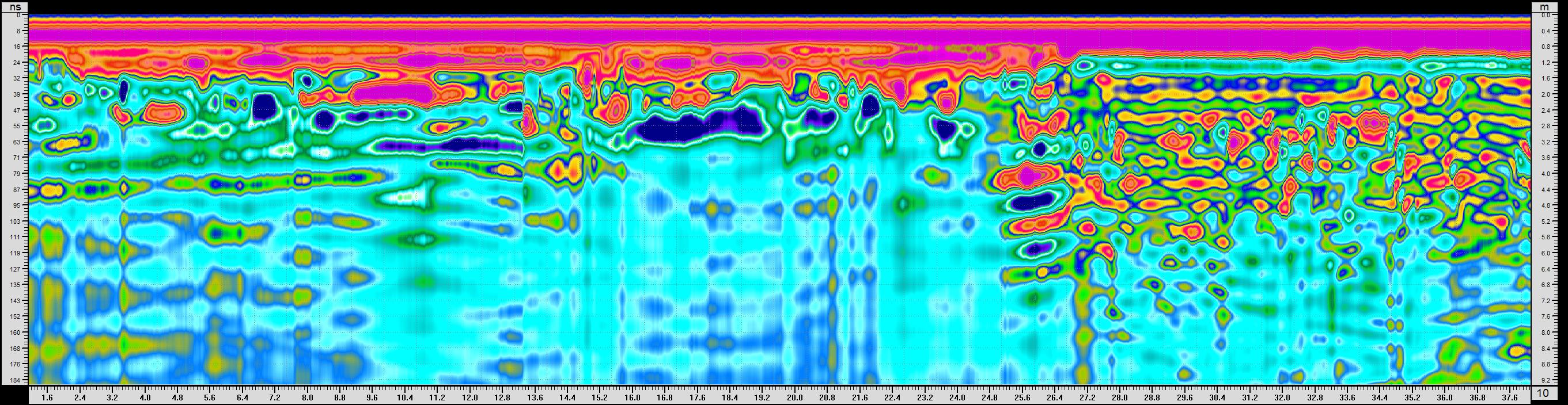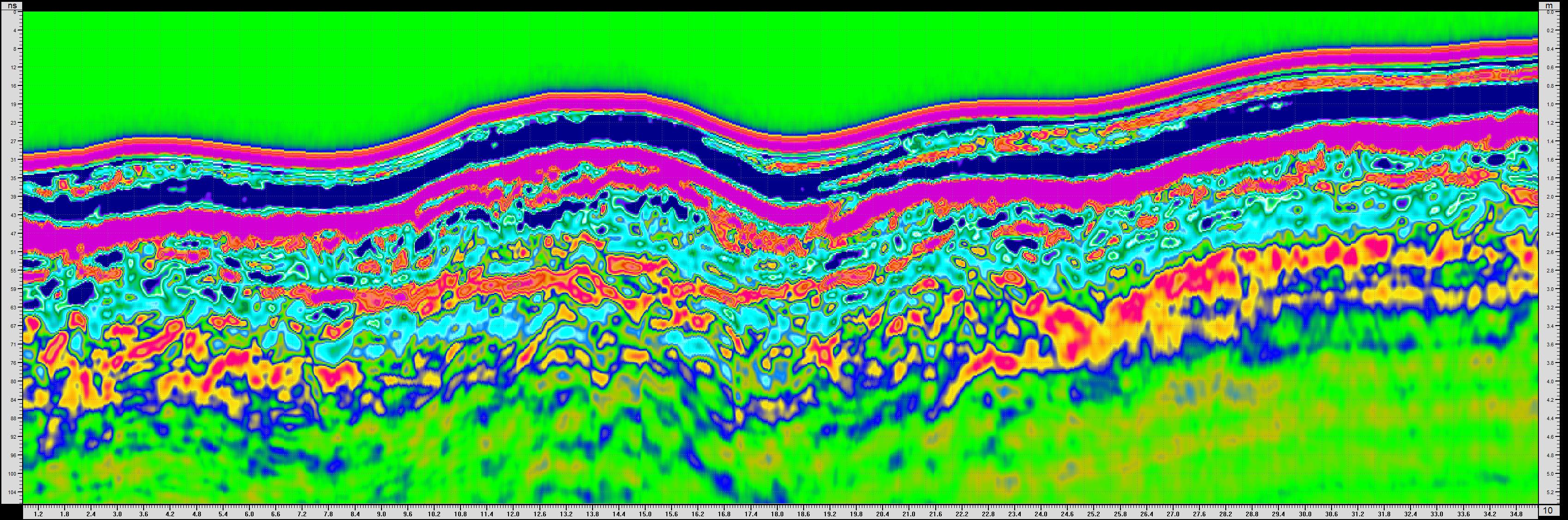 Nový program Spirio (2021) pro zpracování dat z našich širokopásmových antén přináší velmi dobře prokreslené radarogramy, které poskytují nevšední pohled na průzkumy do malých hloubek používaných v archeologii. Jsme schopni rozlišit velmi malé změny ve vodivostech a permitivitách jednotlivých materiálů a spolu s novým typem vysílače, který může vyslat až 3000 impulsů za vteřinu, si můžeme dovolit měření profilu s krokem od 2 mm. To umožnuje dostat velmi podrobné obrysy nalezených anomálií. Pokud navíc ještě použijeme skupinu filtrů, používaných v tomografii, můžeme kontury dále zaostřovat. Analyzovat vlastnosti objektů je možné z tvaru a fáze odražené vlny. Barvy odlišují materiály s různou permitivitou a vodivostí, barvy tedy neurčují materiál. Hlína tak může mít i několik barev, podle toho jak se mění např. její obsah vody. Ten může být v místech, kde bylo kopáno různý. Jednou porušené vrstvy si uchovají tyto vlastnosti už navždy. Můžeme tak sledovat výkopy vzniklé před mnoha tisíci lety i geologické vrstvy, které dělí od svého vzniku několik milionů let. Pro zobrazení hodnot v následujících radarogramech byly použity různé barevné stupnice.
