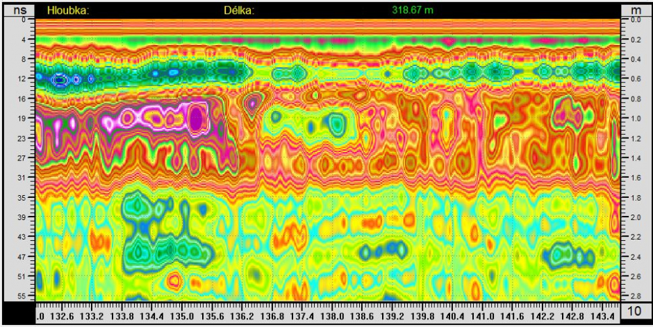 Slovensko, Nitra. Z průzkumu před stavbou průmyslového areálu. Data z roku 2015, krok měření 10 cm, georadar tažený autem, zpracováno nově 2021. Záplavová oblast s množstvím mokrých vrstev hlín a jílů. Jedny z nejhorších podmínek pro měření georadarem.