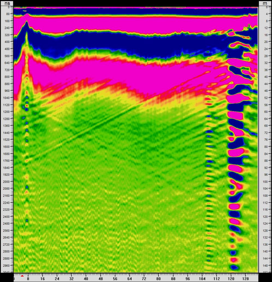 Pokud stejný radarogram upravíme pro vyšší frekvence, můžeme nahlédnout i do struktury puklin. Ta vlevo bude mít místy hladké kolmé stěny, ta pravá bude obsahovat více rozdrcených částí a bude i širší.