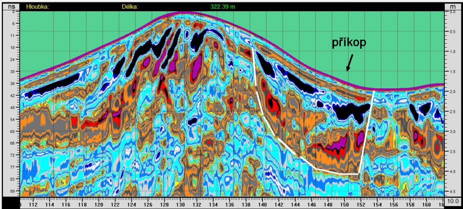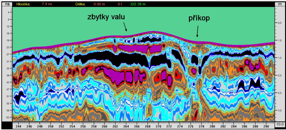 Řez 2 m vysokým valem. Ve středové čáti valu jsou odrazy od svislých objektů. Může tam být zbytek dřevěné konstrukce. Vlevo na valu jsou patrné vrstvy násypu, vpravo je označen obrys dnes už zasypaného příkopu, zajímavý tvar...