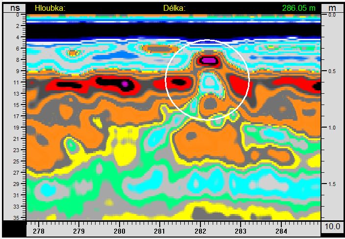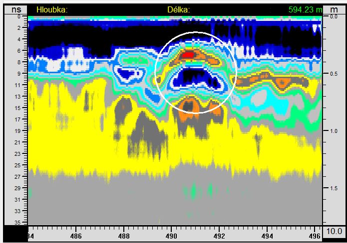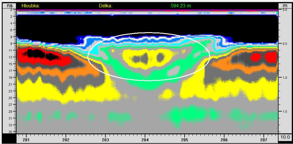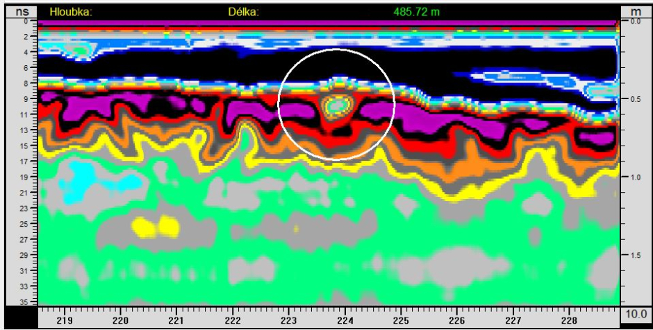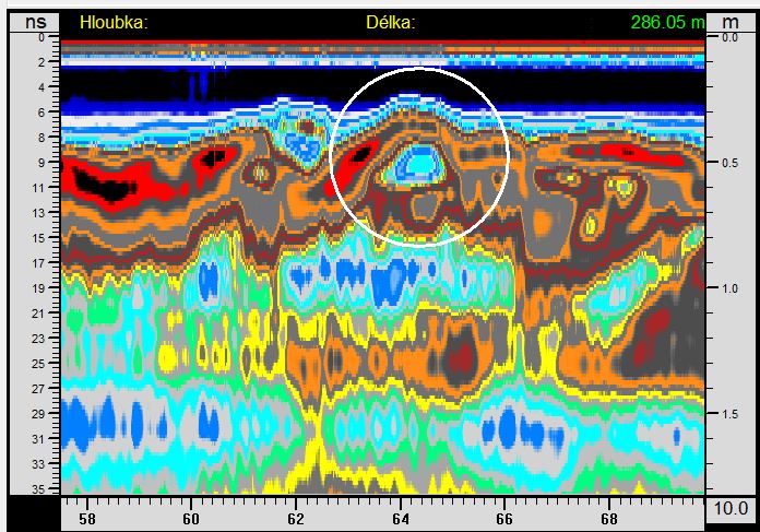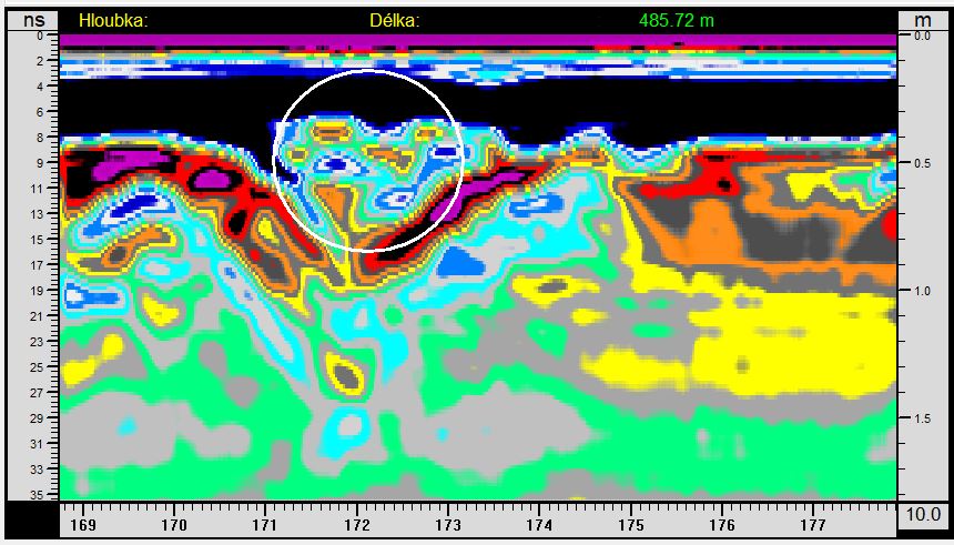 Modře opět materiál s vyšším obsahem vody. Je možné, že objekt je větší a souvisí s ním i ta hnědá oblast dole na hloubce 1,3 m.