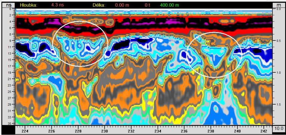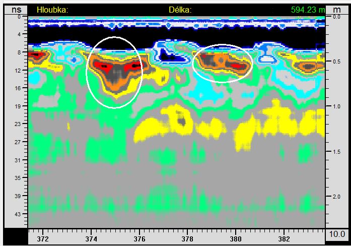 Po vizualizaci objektů v prostoru je možné další průzkum georadarem provést na vytipované ploše podrobněji s menšími rozestupy, třeba 50 cm. Pak se už nechají vyznačit i obrysy nalezených objektů. Taková podrobná data lze zpracovat i ve 3D.