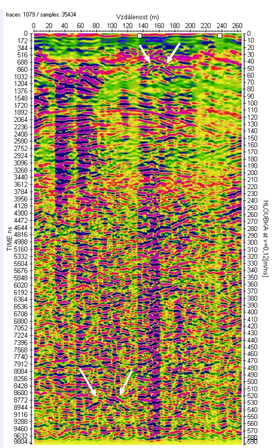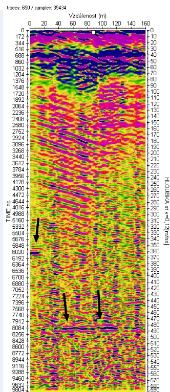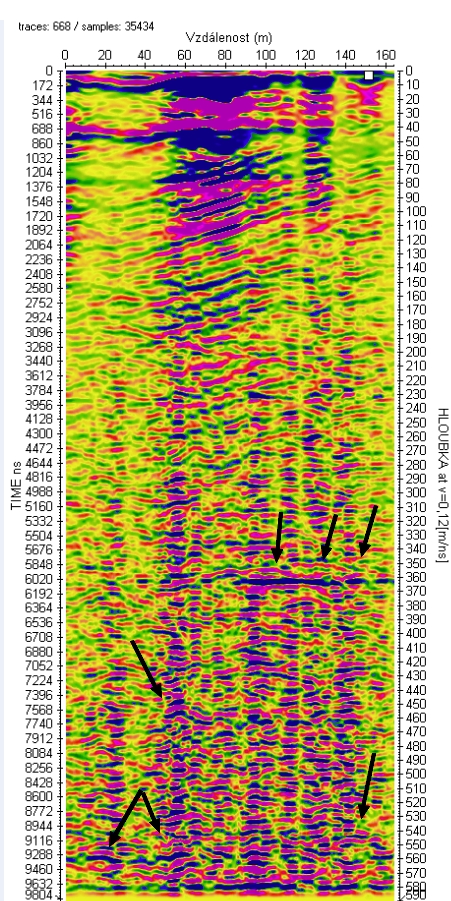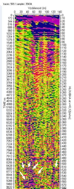 V Hranické propasti se nachází nejhlubší zatopená sladkovodní jeskyně na světě. Celková hloubka propasti je 473,5 m (2016), zatopená část je hluboká 404 m (2016). Po setkání s paní Vysokou na Speleofóru 2016 jsem byl požádán o příležitostné proměření okolí propasti georadarem. Taková příležitost se naskytla v listopadu při zpáteční cestě ze Slovenska. Na místo měření dojel i pan Kalenda, který byl dobře obeznámen s místní situací a navrhl směry měření profilů. Chtěli jsme zachytit známé dutiny blíže pod povrchem (do 100 m) a pokusit se nalézt hlouběji uložené anomálie. Na měření jsme použili 6 m dlouhé antény s centrální frekvencí 25 MHz. Po nedávných zkušenostech z měření ve Slovinsku jsme georadar nastavili na časový záznam do 10.000 ns, který by měl teoreticky zachytit odrazy z hloubky přes 500 m. Ve Slovinsku byly nejhlubší odrazy kolem 250 m, takže jsme se domnívali, že máme dostatečnou rezervu. Změřili jsme za dvě hodiny asi 1800 m proflů na zoraném poli i v lese kolem propasti. Na monitoru byly při měření vidět anomálie do hloubky kolem 50 m. Největší překvapení nás čekalo další den při zpracování dat na PC. Radarogramy byly krásně čitelné po celé délce záznamu až do hloubky 500 m (při předpokládané rychlosti vlny 12 cm/ns). Chybička - příště to nastavím do dvojnásobné hloubky. I tak je to asi jedno z nejhlubších měření na světě georadarem na této frekvenci, alespoň na internetu jsem nenašel radarogramy z hloubek nad 100 m kromě měření v ledu, ale tam jsou naprosto jiné podmínky. Na několika profilech se nám podařilo zachytit známé i dosud neznámé dutiny i horizontální rozhraní vrstev, které velmi dobře výškově korespondují se stupněmi ve svislém řezu jeskyně. Podrobnou zprávu zpracoval p. Kalenda.