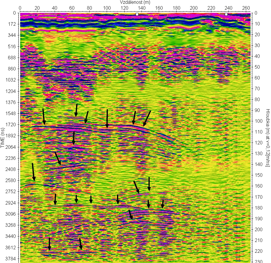Profil těsně podél Hranické propasti s podrobnějším rozlišením a omezením do hloubky 230 m. Většina označených odrazů může být od dutin se vzduchem, napovídá tomu fáze odraženého signálu.