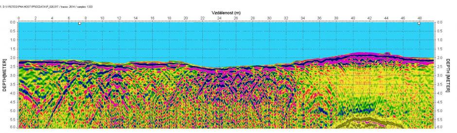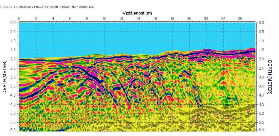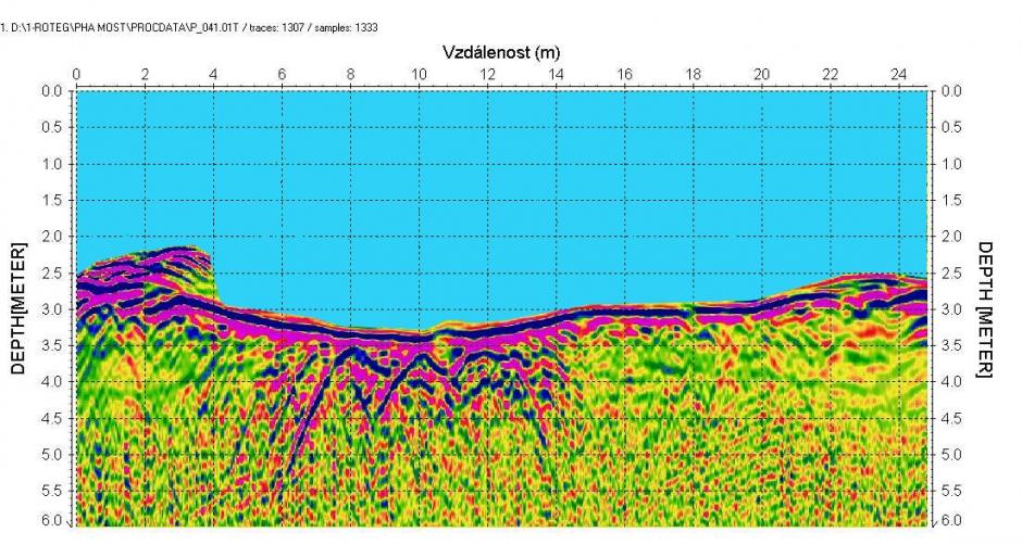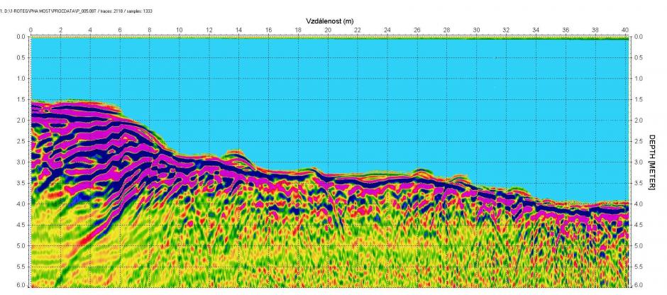 Zde je několik radarogramů. kde jsou silné odrazy od větších objektů. Drobné odrazy budou od menších kamenů. Vrstvy usazenin jsou vidět jen někde, voda je asi často rozplaví, vrstvy jílů a bahna jsou proudem odneseny. Bude zde patrně převažovat písek, štěrky a pár větších kamenů.