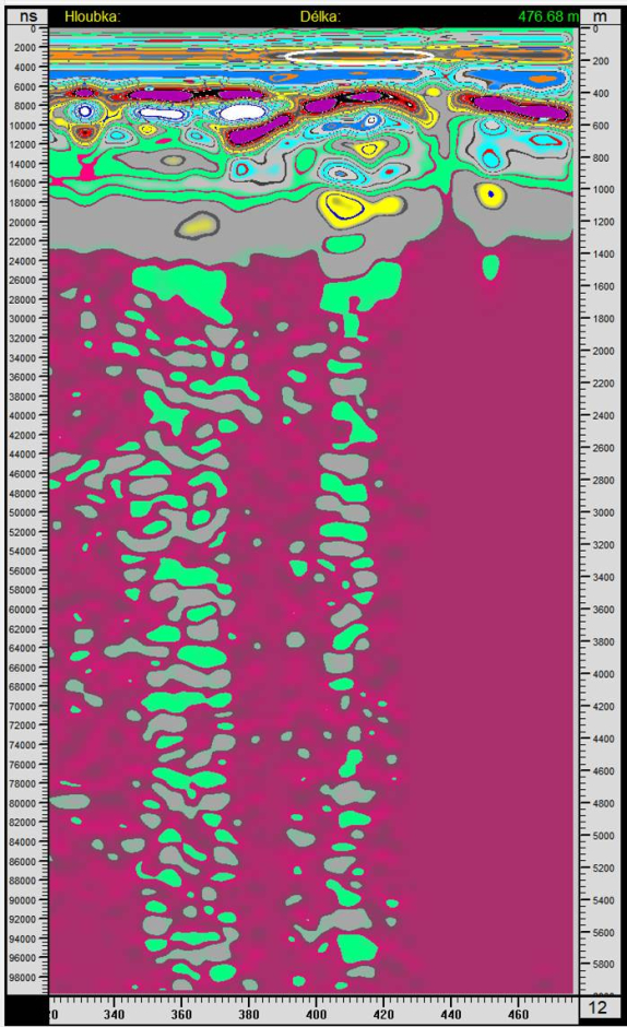 Antény georadaru pro nízké frekvence nejsou stíněné proti odrazům od předmětů nad zemí. V současné době nevím o stínícím materiálu, který by byl účinný pod frekvence 50 MHz. Již na 100 MHz jsou problémy se stíněním. Ano, zachytáváme všechny vzdušné odrazy. Kromě hyperbol se nechají velmi dobře z radarogramů odstranit.