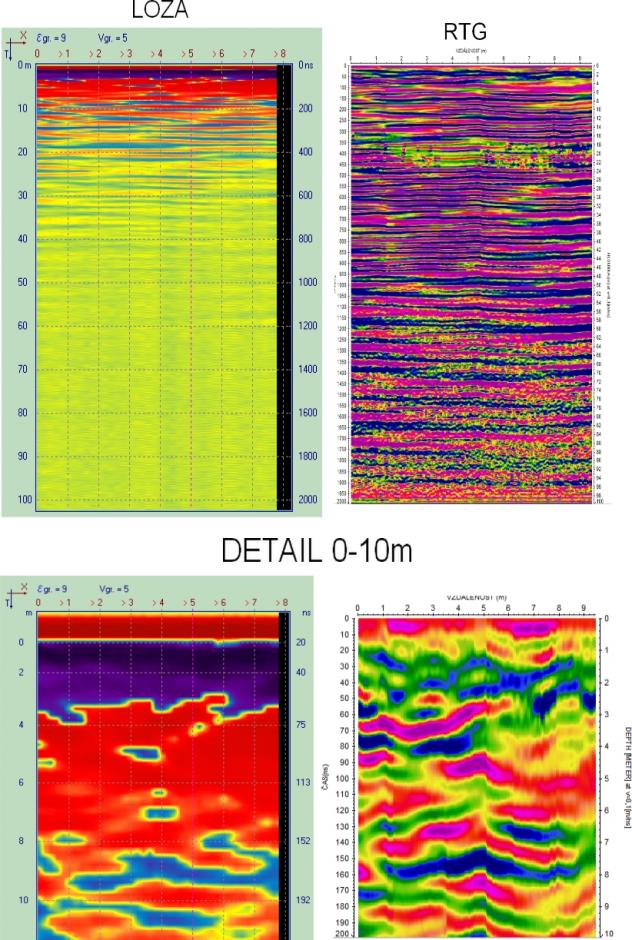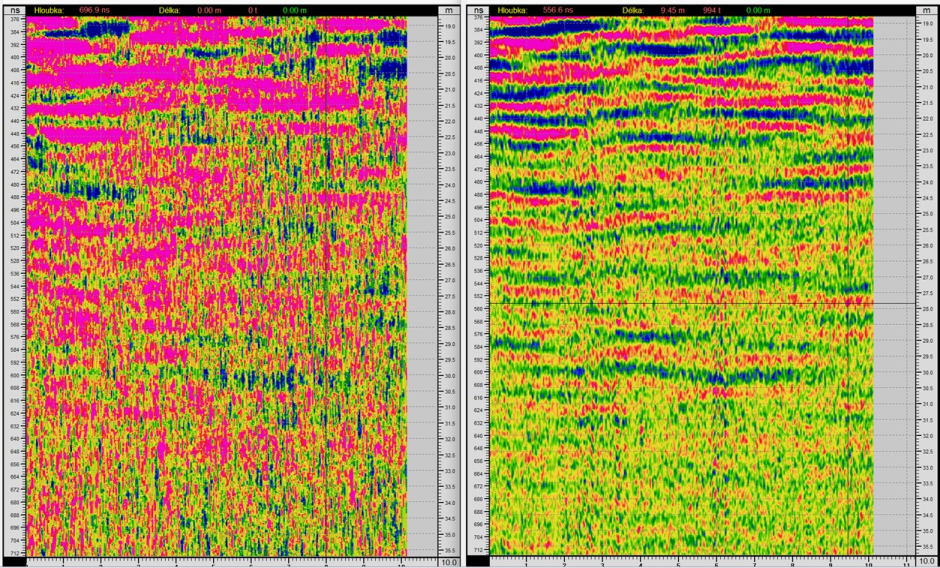 Níže je radarogram s anténami 150 MHz. První 1m vrstva hlíny, pak žlutá spraš a na 3 m hloubky vápencové (slíny, opuka) skalní podloží až do 100m. Levý sloupec s originálními anténami od výrobce, vpravo nově vyvinuté. Zlepšení rozlišení v prvních metrech hloubky! Ostrá rozhraní a několikanásobně vyšší intenzita odražených signálů. Omezení vzdušných odrazů v levé části radarogramu. Měření záměrně začíná u velké kovové kostrukce.