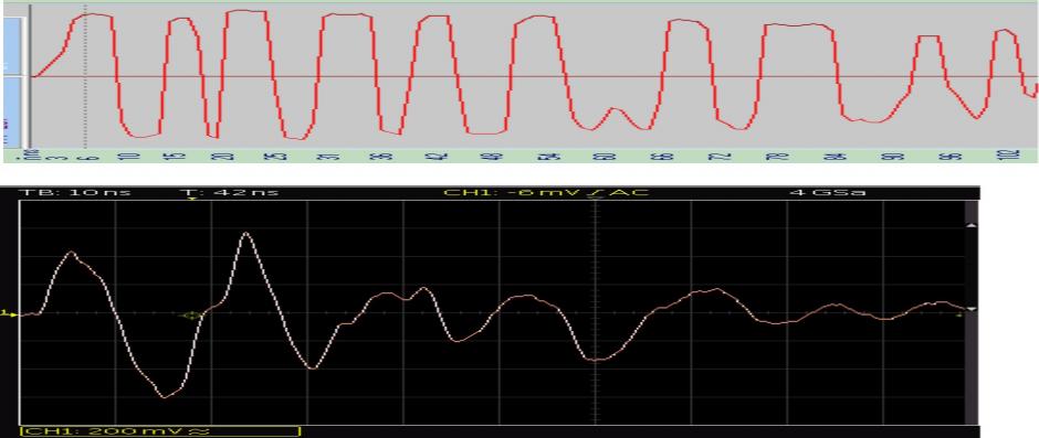 Záznam vlny z Lozy a dole z nového přijímače (zatím jen 8bit), zobrazení oscoloskopem. Odstraněna limitace a časové nasrovnalosti v záznamu vlny.