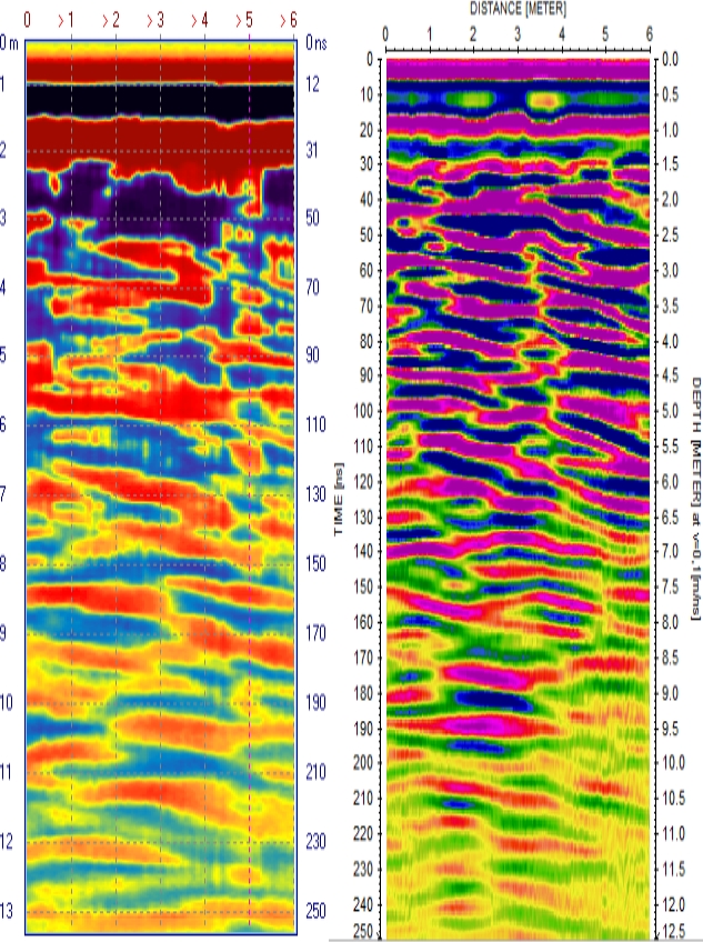 Na radarogramu to pak vypadá takto: Vlevo původní, vpravo upravený filtrem. Je to rozhraní dvou typů hornin s trhlinou. V pravém obr. je mnohem více podrobností.