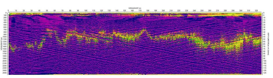 Žula, antény 100 MHz, struktura je patrná místy až do hloubky 100 m. Vpravo nahoře asi štola.
