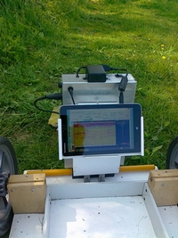 Černá krabička na horní části je GPS s přesnostií asi 1 m. Souřadnice se vkládají do naměřených dat každou vteřinu. Dosažená rychlost měření 100 pulsů za vteřinu umožňuje tahat antény za autem. Při rychlosti 10 km/hod můžeme měřit s krokem 15mm nebo můžeme nastavit krok 15cm a v něm průměrovat 10 naměřených pulsů. Takto je možné táhnout antény i kolmo k měřenému profilu. To bylo v původním uspořádání velmi obtížné, na obsluhu bylo potřeba 5 lidí, 4 přenášeli antény po několika cm po nataženém měřícím pásmu a pátý tisknul tlačítko. Toto uspořádání je vhodné na vyhledávání podzemních chodeb, velkých dutin, zlomů kolmých na směr měření apod.