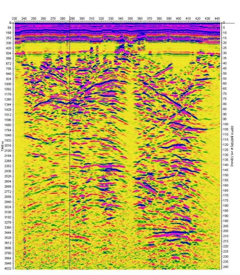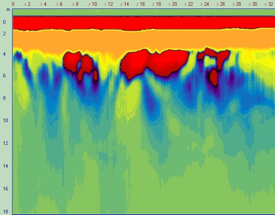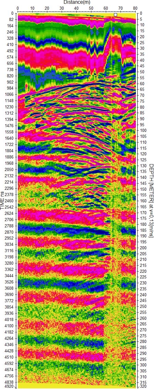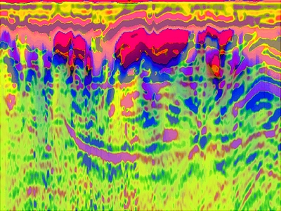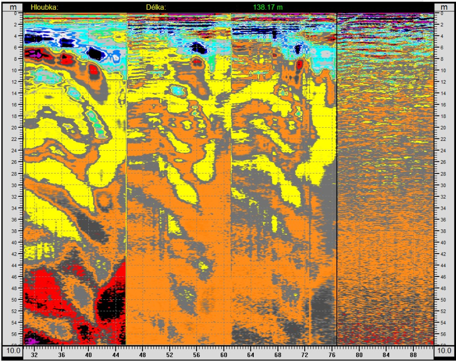Stále ještě nejsme na základním rozlišení měření. Tento radarogram je měřen do hloubky po bodech v rastru 10x10 cm (lze to i zjemnit až na 2x2 cm), zde je plocha obrázku 440x100 m. Body mezi sebou jsou průměrovány, dva vedle sebe a čtyři nad sebou, nejsou to tedy žádné matematické výmysly, sledujeme stále jen změny fáze vlny a její intenzitu a hodnotám přiřazujeme barvy.