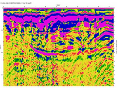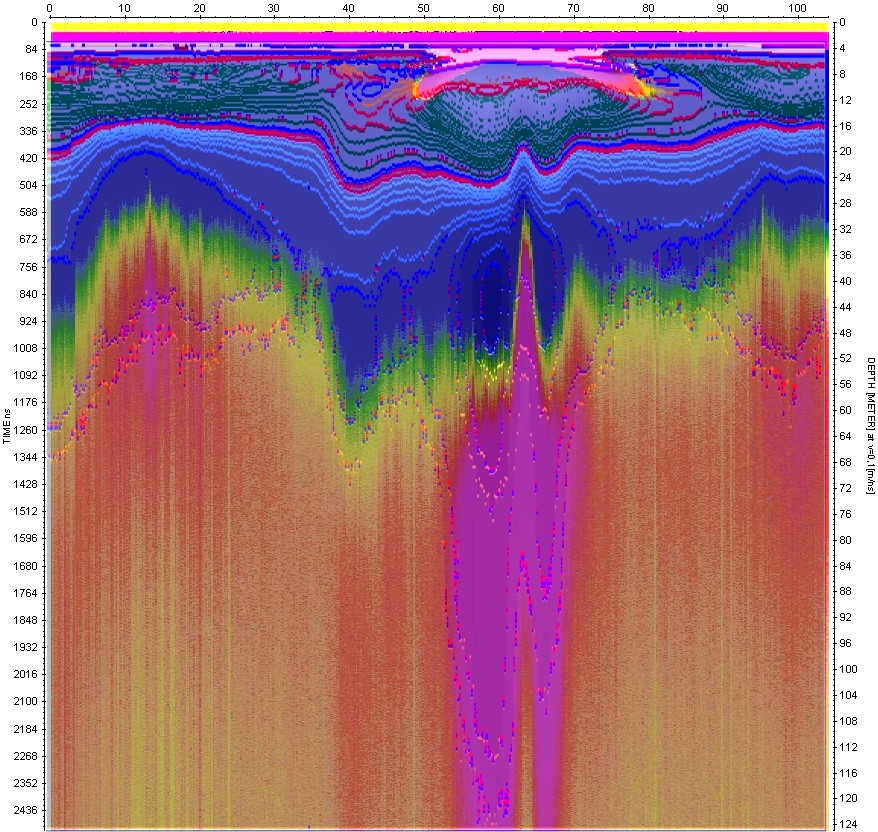 Srpen 2020 - zásadní průlom ve vyhodnocování radarogramů, rozšířili jsme program Spirio o nový dynamický filtr pro vyhledávání transverzálních singularit. Můžeme mnohem komplexněji zpracovat všechna data zaznamenaná příjímacími anténami na celém spektru frekvencí. Dutiny v horninách s velkým útlumem, které jsme dřív neviděly, jsou teď nepřehlédnutelné. Odrazy kopírují tvar dutin, můžeme zkontrolovat znovu všechny radarogramy za posledních 7 roků...asi tak 15.000. Běžné programy tento filtr nemají, pouze částečné náhražky a takto čistý odraz, jako je dole nedokáží získat i když jsem si s tím dal několika hodinovou práci v běžném vyhodnocovacím programu.