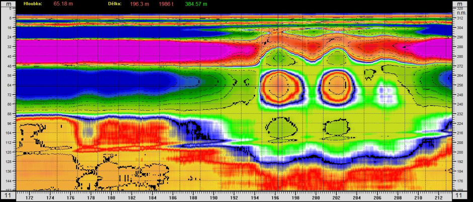 A to není vše, pokud si uděláme detail té fialové oblasti na hloubce 200 m, tak můžeme usoudit, že ta horní černá oblast nad ní se skládá z horizontálních vrstev nějakého velmi drobného materiálu a ta fialová oblast bude asi z nějakých kamenů, nebo dutin. Detail je dole.