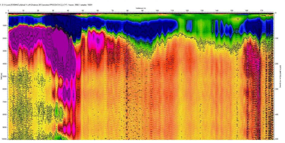Prosinec 2013 - měření v Českém Středohoří, Chrámce, porcelanity, 25 MHz, nahoře hlíny a jíly, pod nimi snad vápence, v levé části asi zvětralá trhlina. Časový záznam do hloubky 500 m při rychlosti vlny 10 cm/ns.