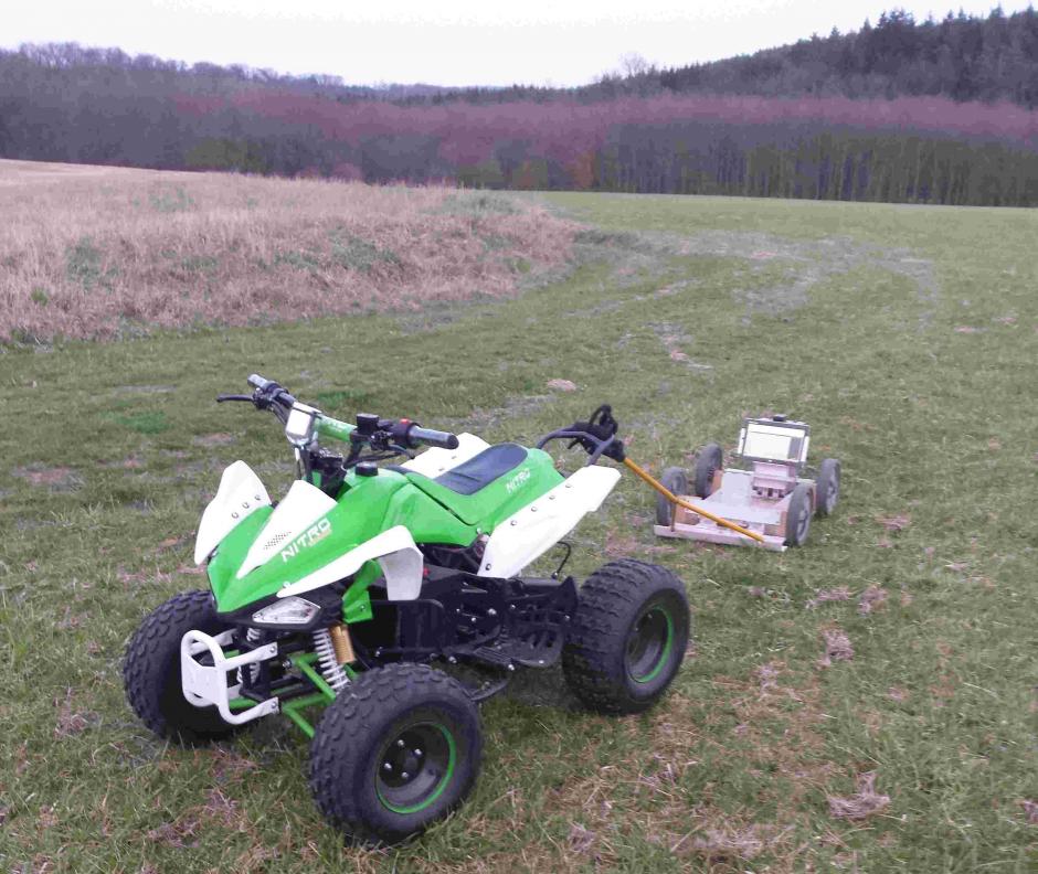 Duben 2015 - k naměřeným datům jsme připojili data z GPS, umístěné na přijímači georadaru. V programu Google Earth pak vidíme celou trajektorii a lze snadno zobrazit na mapě v radarogramech nalezené anomálie. Se čtyřkolkou lze najezdit za hodinu 5 -10 km profilů. Ideální pro archeologii, trasování inženýrských sítí i pro průzkum geologických struktur.