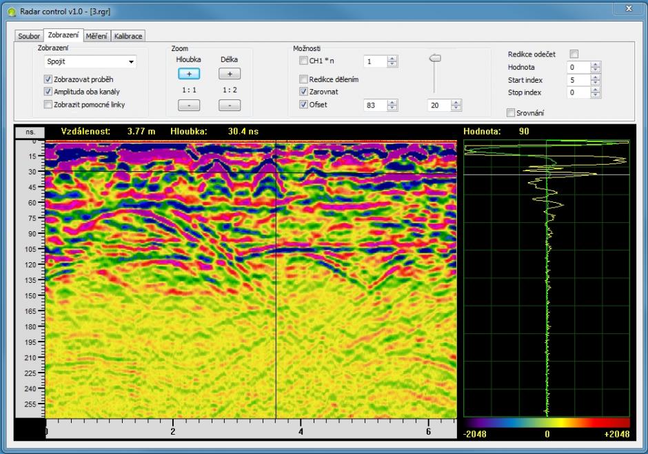 Březen 2021 - stále žádné zakázky i díky Covidu. Vylepšujeme tedy SW na vyhodnocení dat. Řada programů používá hlavně frekvenční filtraci ke zvýraznění užitečných dat a k potlačení těch nežádoucích. Existule i zpracování dat samotného obrázku radarogramu, používají to ruské programy, je to podobné vyhodnocení jaká se používají u zpracování dat z tomografů. Lze tam například zaostřovat, vyhledávat velmi malé změny na silných signálech atd.. Pokoušíme se spojit oba tyto systémy do jednoho programu.