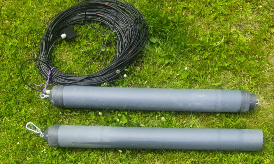 Květen 2024 - potřeboval jsem udělat měření georadarem ve vrtu 80 m hlubokém. Poptal jsem ho a zjistil jsem, že je tu jen jeden georadar a to pouze do 50 m. Pustil jsem se tedy do stavby Rotegu do trubky o průměru 70 mm. Vzal jsem odpadní šedou PVC rouru s 2 mm stěnou, napohled docela pevnou, dal jsem tam dvě víčka a celou jsem ji dal do 200 mm roury s vodou a víčky, zajištěnými pevnou kurtou. Nechali jsme tam asi 10 cm vzduchu a přes ventilek jsme rouru natlakovali kompresorem na auto na 3 bary. To byla šlupka! To větší víčko se změnilo v plastický materiál a mezerou asi 3 cm vyletělo ven. Trochu mě to polilo, ale větší překvapení bylo, že ta trubka uvnitř byla promáčklá. Pokud je vrt 80 m hluboký a je tam voda, tak tlak je tam 8 barů. To není legrace udělat těsnění a průchodky pro kabely pro takový tlak. Takže volba padla na 100 mm rouru z Meduru s vnitřním otvorem 70 mm, stěny 15 mm. Do jednoho tubusu jsme dali antény s vysílačem a s akumulátory. Ten pracuje zcela autonomně. Druhý tubus má pouze přijímací anténu a koaxiální kabel k přijímači. Délka kabelu 100 m, ve vrtech není žádný rušivý signál, takže se tam nedával ani zesilovač. Antény jsou na frekvenci 200 MHz. Test ve vrtu 80 m byl bez problémů, uvnitř tubusů ani kapka vody, naměřená data ve skále do vzdálenosti 30 m od vrtu - bez VF rušení, nádhera.
