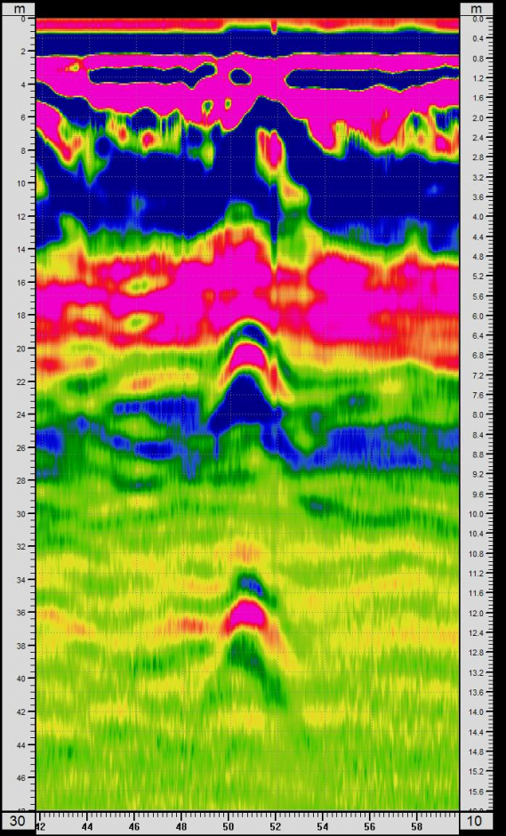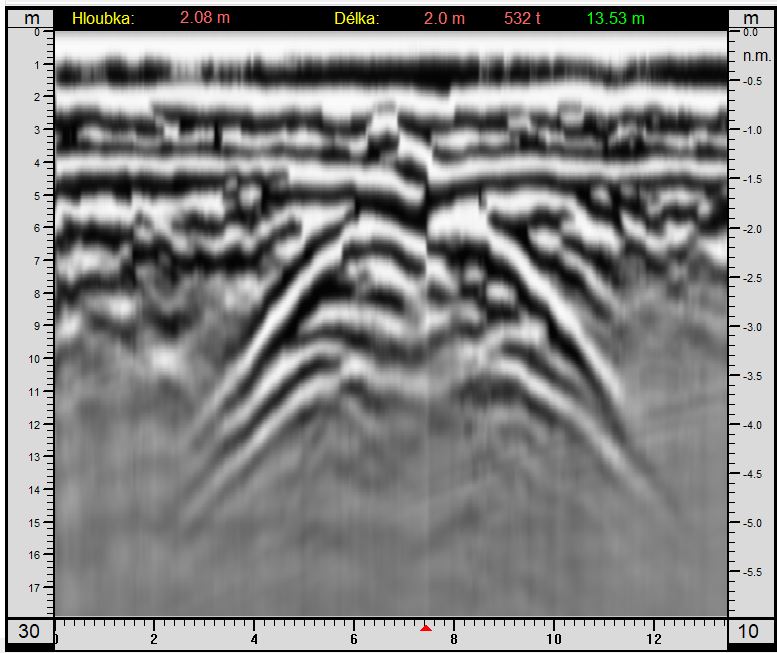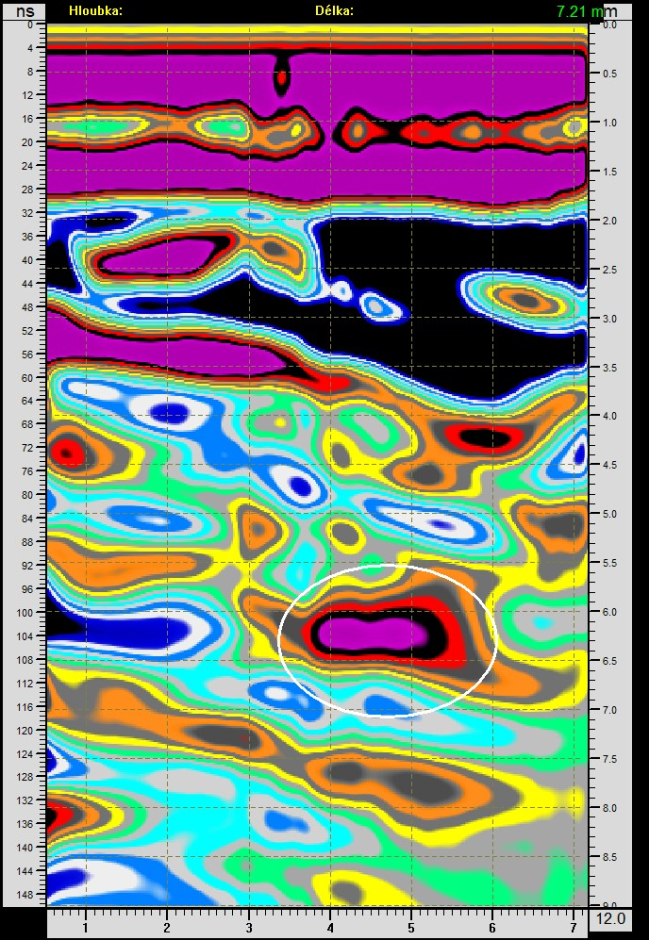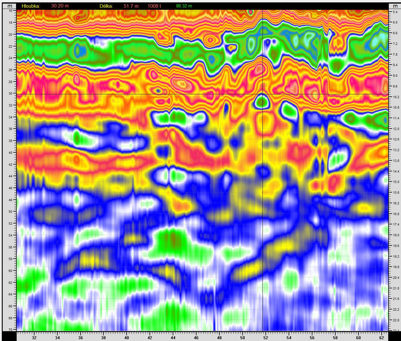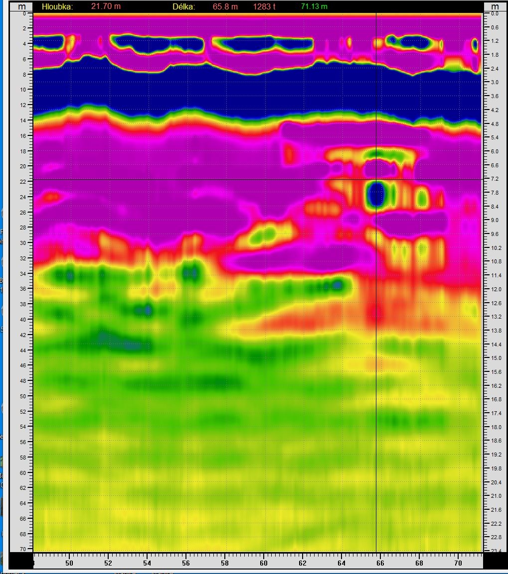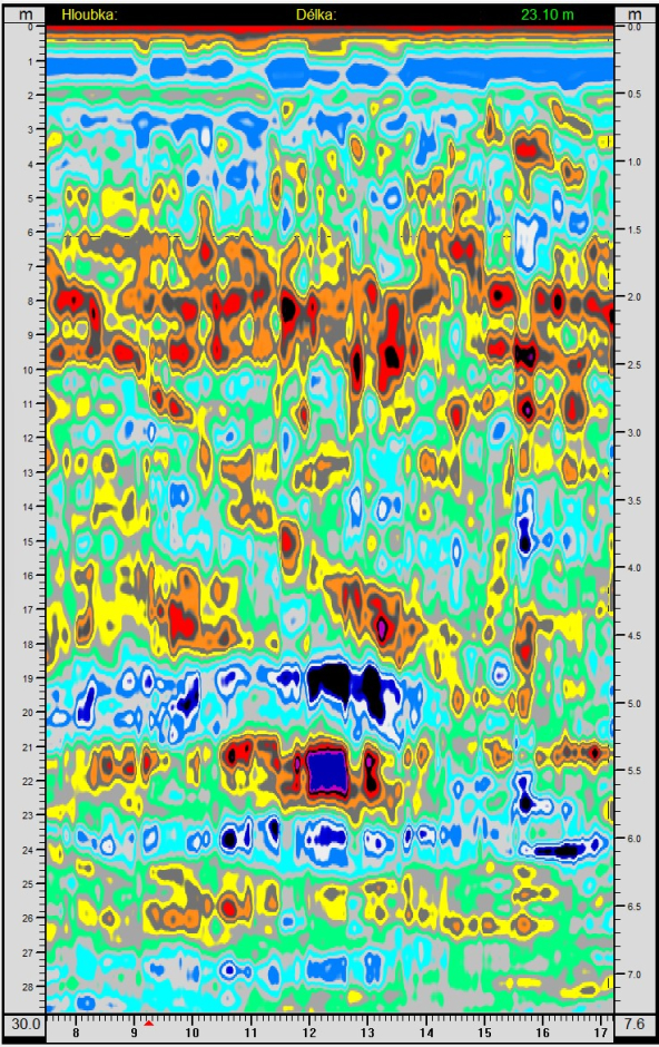Litvínov, hlíny, poddolované území v zástavbě, štola je vpravo dole na hloubce 12 m. zde má jinou fázi odrazu, je patrně vyplněná vodou, jsou pod ní vidět rezonance.