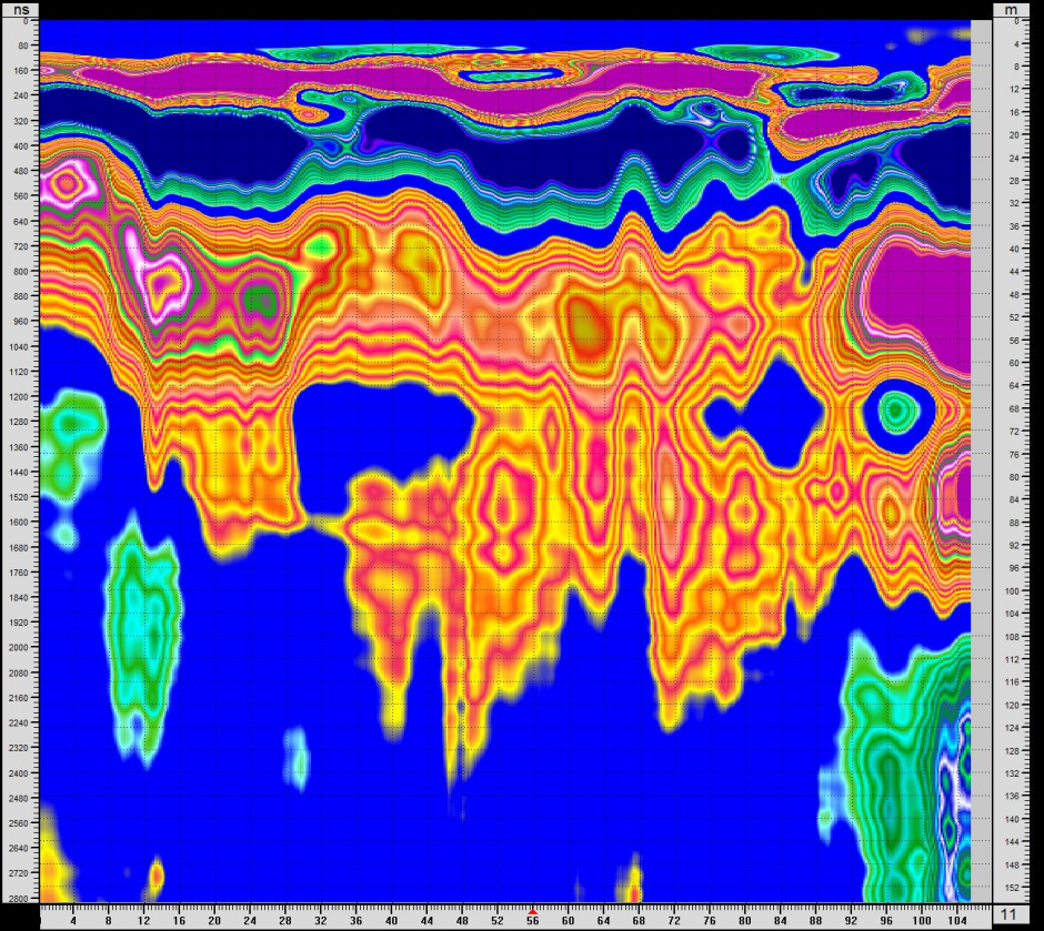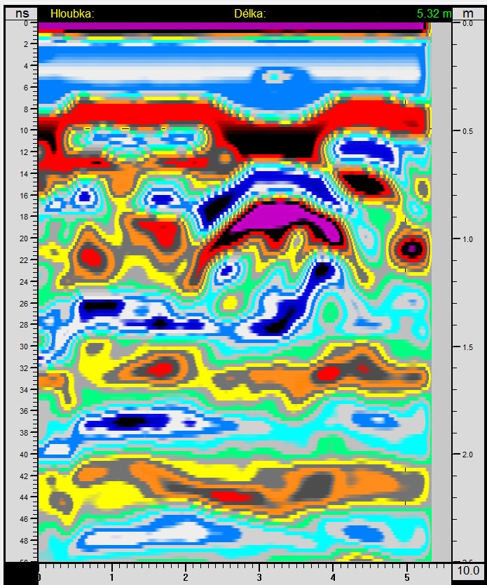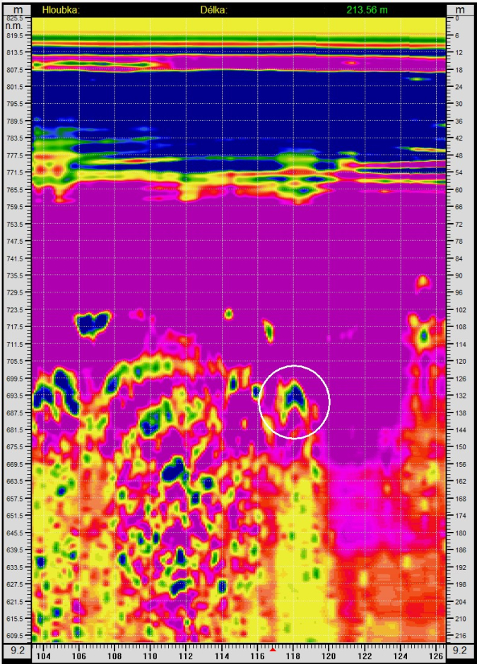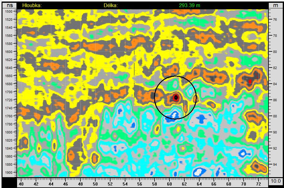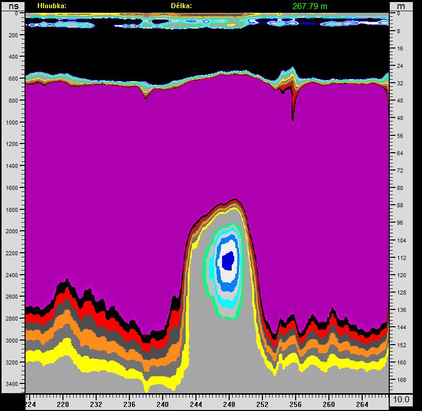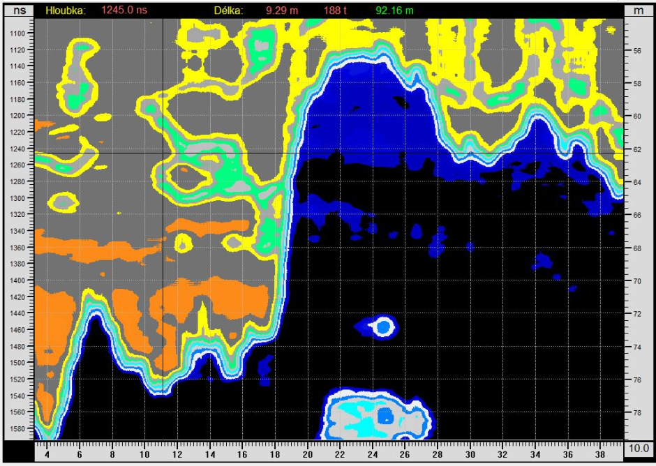 Jílové, štoly po těžbě zlata. Uprostřed dole bílý symetrický odraz od dědičné štoly, hloubka 72 m, šířka štoly asi 1 m, výška 1,5 m. Je to malý objekt ve velké hloubce, nemůžeme zde čekat nějaké silné odrazy. Štola na tomto místě v této hloubce opravdu je. Na celém radarogramu není nikde jinde podobný symetrický odraz. Filtrováno gradientovými filtry ve Spiriu 6. Běžné vyhodnocovací programy takto malý objekt nedokáží v této hloubce najít.