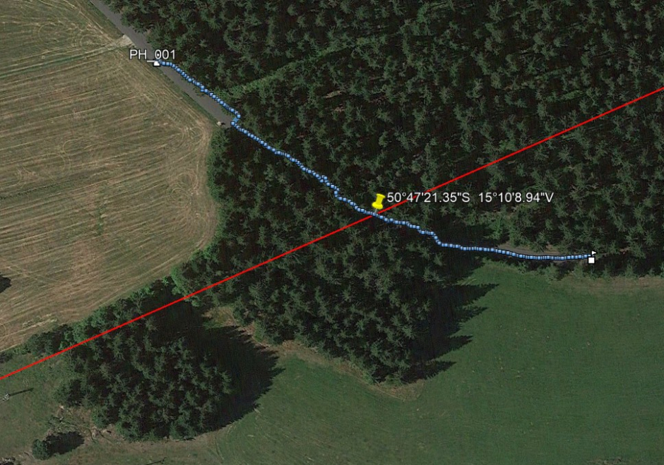 Přivaděč vody z Jozefovské přehrady v Jizerských horách. Měřeno po okraji silnice. Štola ve tvaru obrácené hyperboly, široká asi 2,5 m a 2 m vysoká je zde v místě měření v hloubce asi 130 m ( pro rychlost vlny 9,2 cm/ns). Odraz je kontrastní, symetrický, má tvar stávající štoly a pod štolou se zeslabil signál. To jsou všechno atributy důležité pro odlišení odrazu od štoly od ostatních anomálií v okolí. A to nejdůležitější - odraz je v místě a v hloubce, kudy ta štola podle dokumentace vede. Geofyzik ji tam nevidí! Vyjádření geofyzika k provedenému měření najdeta na uložišti ČAAG. https://drive.google.com/drive/folders/1dNli5_QWLyjjBKUVP8Nz6oIX2mHHz3Sb , je tam ve složce Tengler-Bedřichov. Mé námitky k tomuto vyjádření tam již nenajdete, jsou ale na mých stránkách zde.