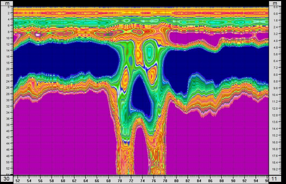 Asi dutina plná vody v hloubce přes 100 m, nedaleko přivaděče vody pro město, České středohoří. Zobrazeno v nízkofrekvenčním spektru. Červená oblast jsou patrně vápence.
