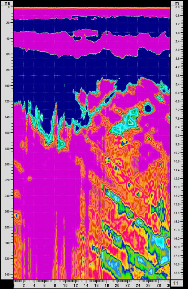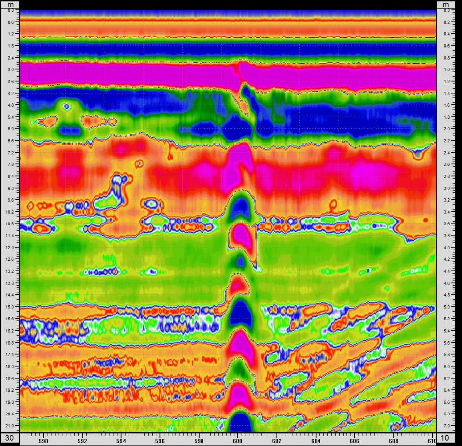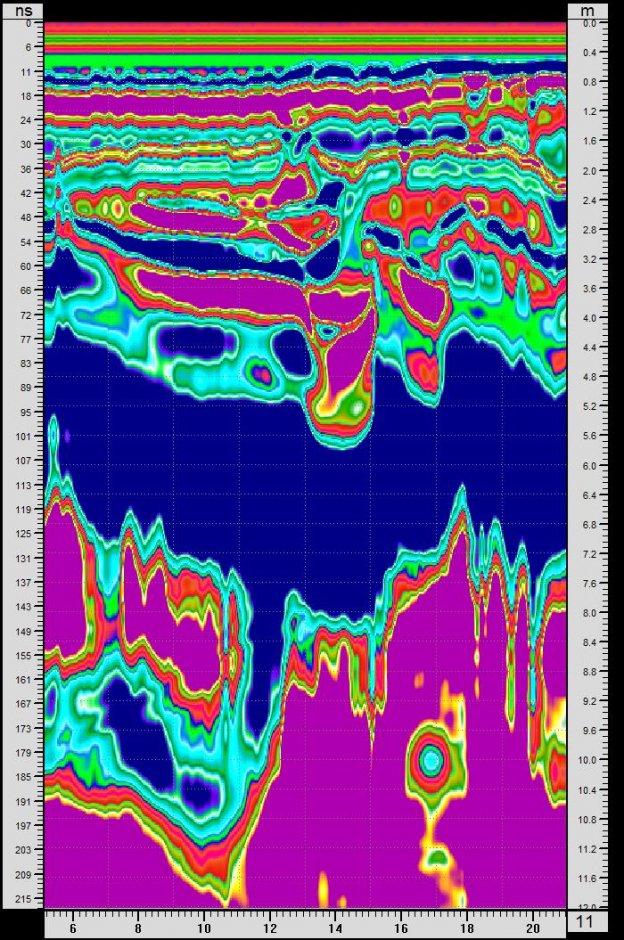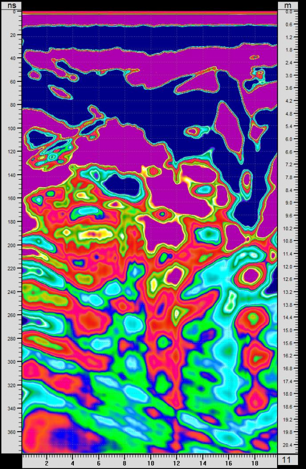 Některé níže uvedené radarogramy jsou filtrovány naším novým programem Spirio (2020), mají vlevo stupnici pro rychlost vzduchu. To nám umožňuje vykreslit velmi pravděpodobný průřez štolou v proporcionálních rozměrech. Odrazy štol zde mají symetrický tvar a to také hodně pomáhá k jejich identifikaci, zejména ve větších hloubkách. Fáze odrazu vlny zde není vždy ve sledu barev modrá-červená-modrá. Je to dáno zvolenou barevnou stupnicí a typem filtrování, některé pásmové filtry otáčejí fázi a při vyhodnocování vlastností dutiny je na to potřeba dát velký pozor, zde byla dána přednost výraznějšímu barevnému zpracování.