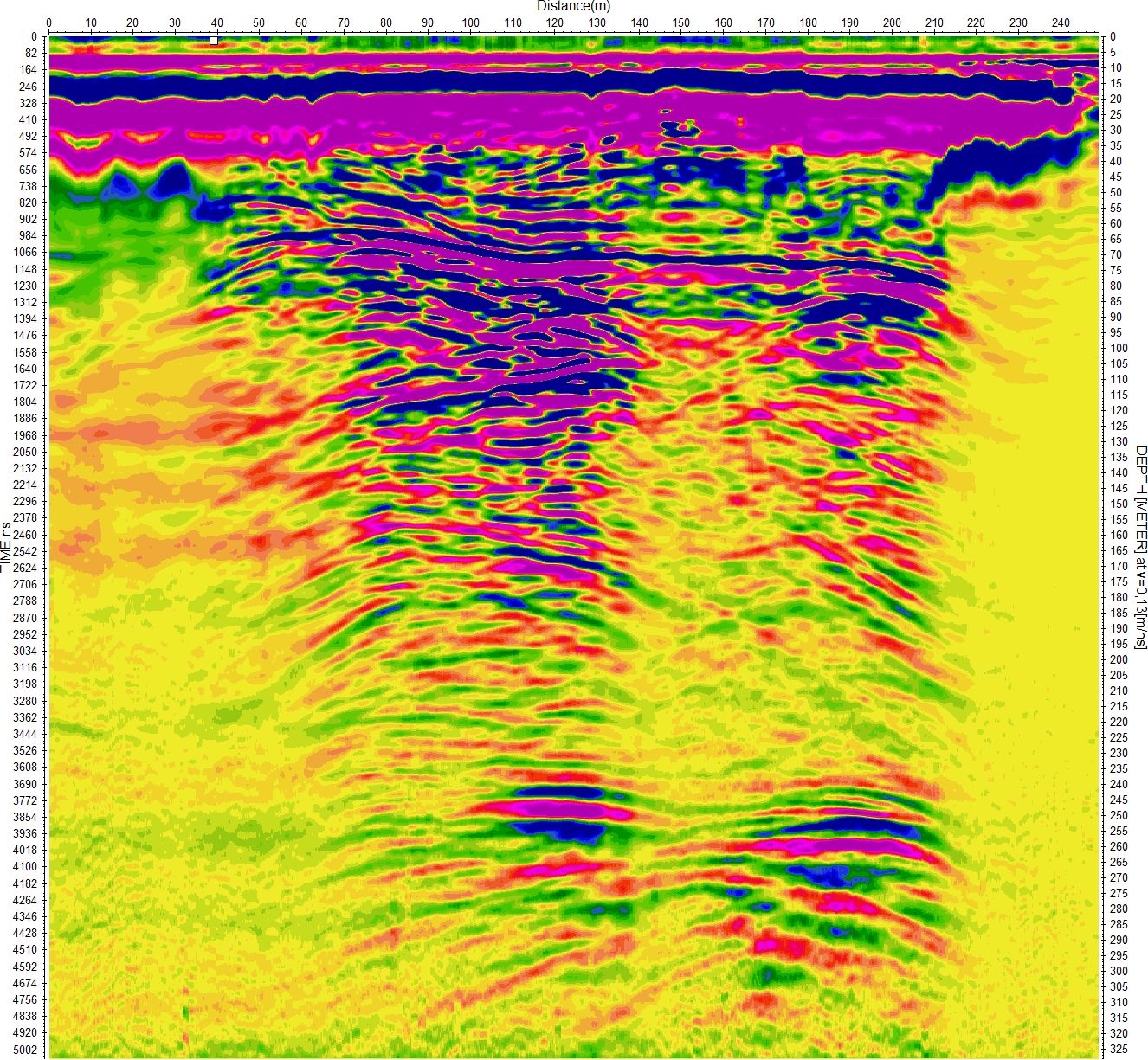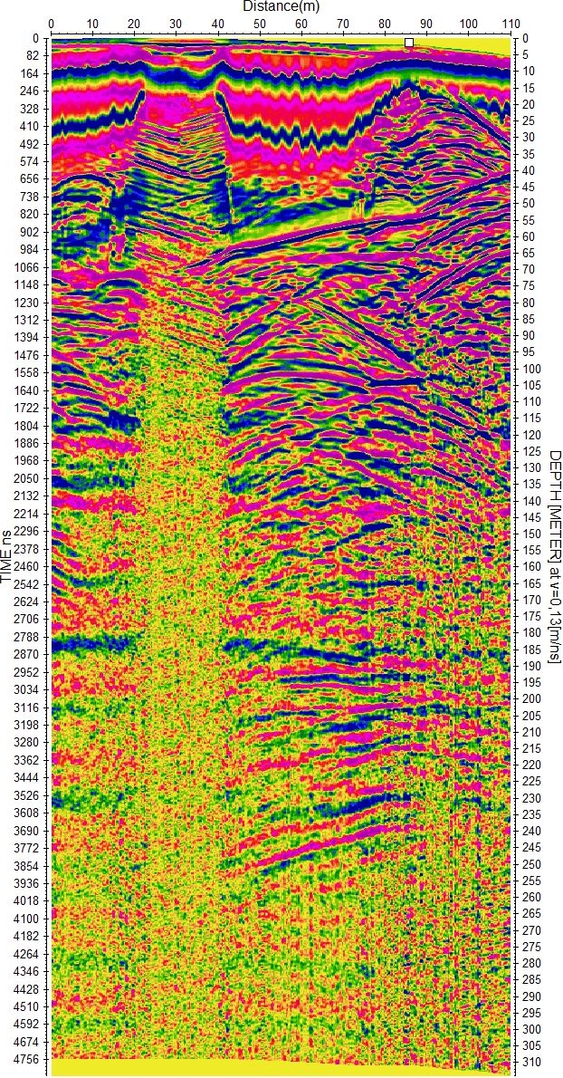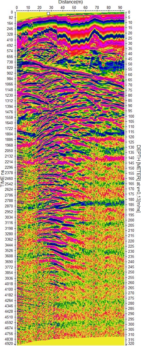A zde jsme projeli ještě jeden trochu delší profil s dvakrát delšími neupravenými anténami o délce 6 m. Zvlněná dlouhá modrá linie na hloubce kolem 60-70 m je opět rozhranní vápenců. Vpravo na vzdálenosti 190-200 m je v hloubce 85 m obrovská dutina, pokud je tam vzduch, bude její výška 15-20 m. Další dvě obrovské dutiny jsou na hloubce 250 m na vzdálenosti 110 m a 190 m. To je ale o 100 m níže než je dno Macochy, že by tam byl další jeskynní systém?